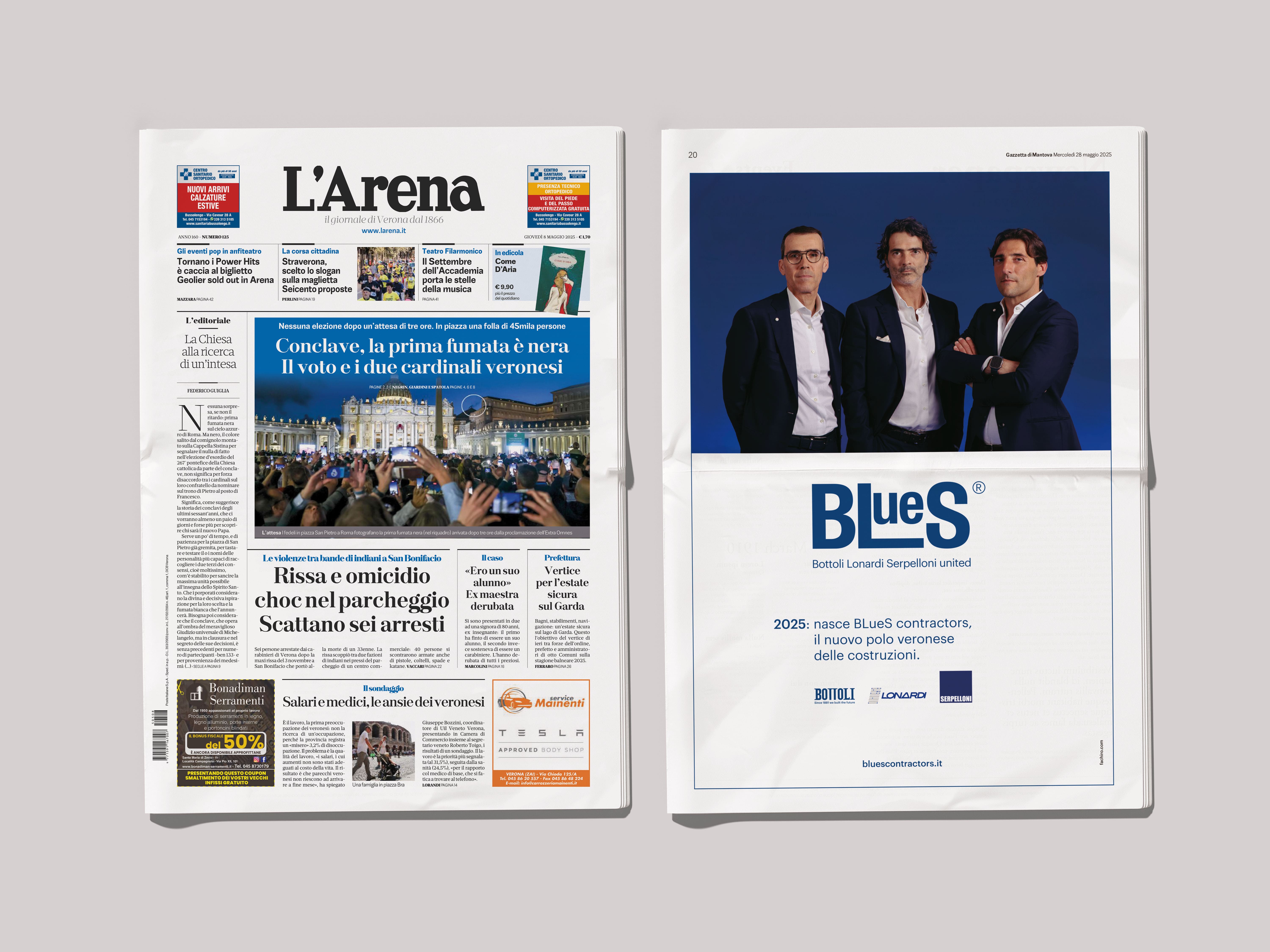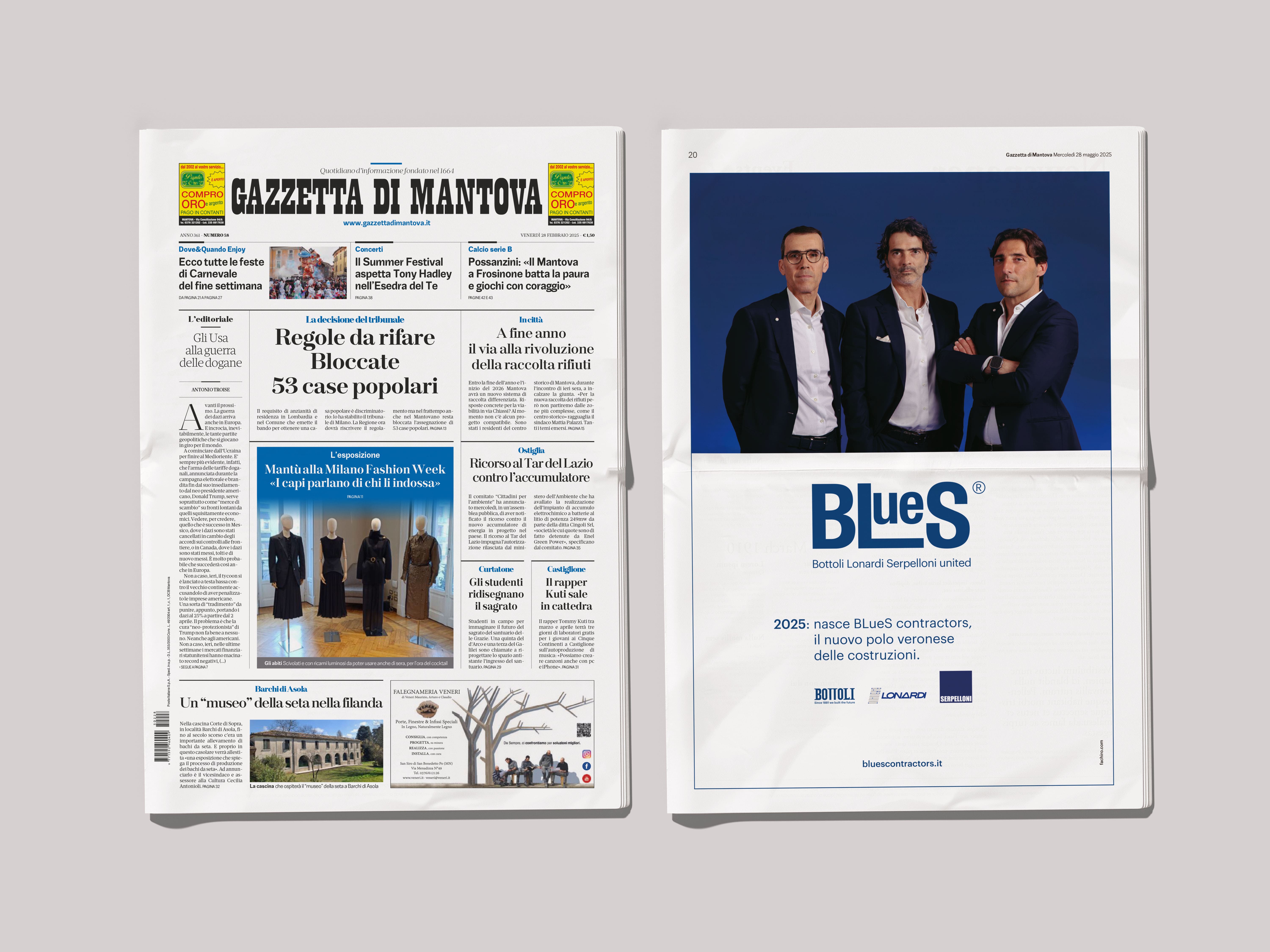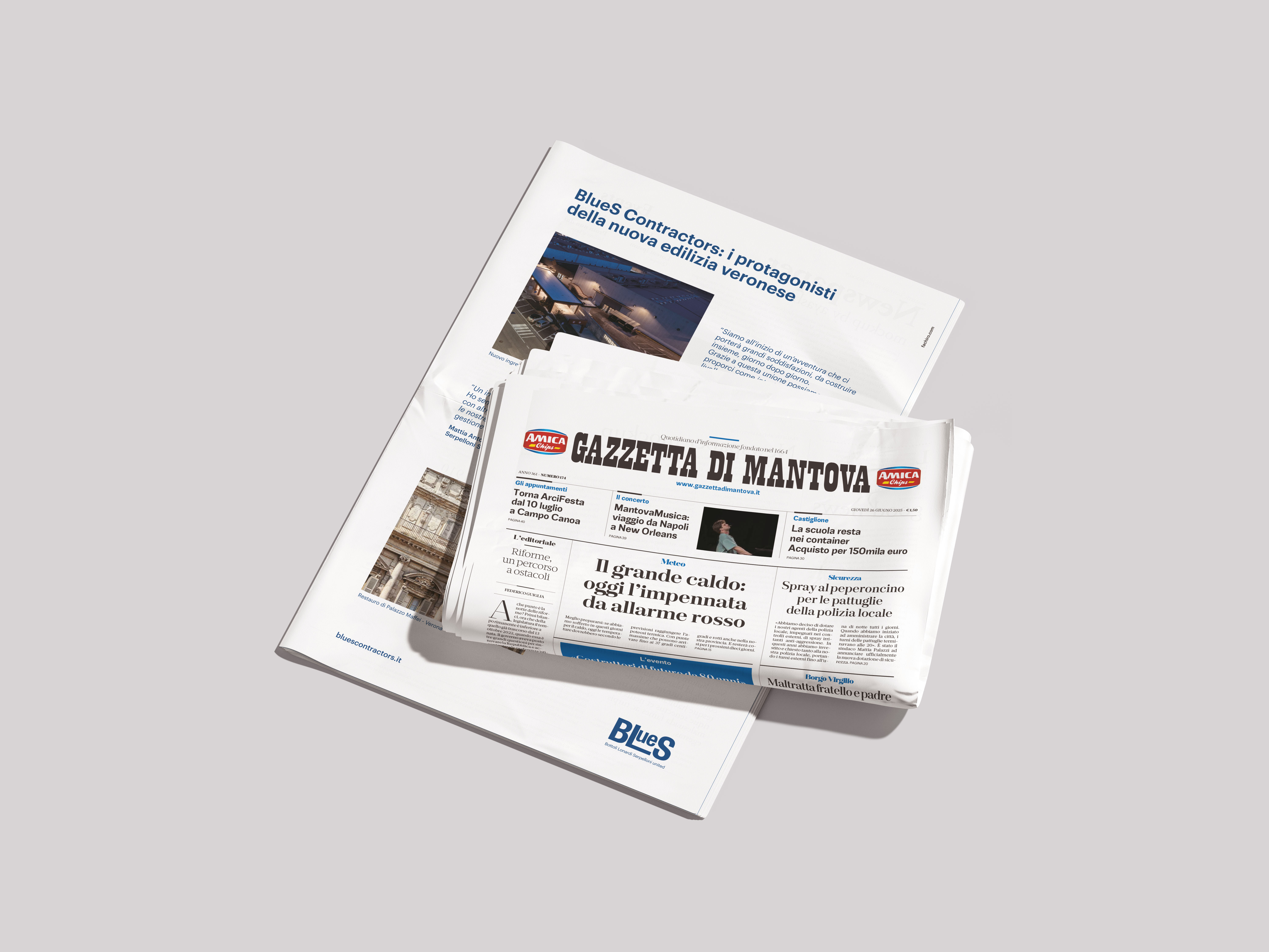 Per promuovere la nuova identità, sono state realizzate campagne pubblicitarie sui principali quotidiani del Gruppo Athesis, con particolare visibilità su L'Arena e su la Gazzetta di Mantova, con focus su inserti tematici di Geopolitica e Sostenibilità. Un mix tra radicamento territoriale e attenzione ai temi attuali, che ha permesso a BLueS Contractors di comunicare in modo efficace la propria architettura visiva.