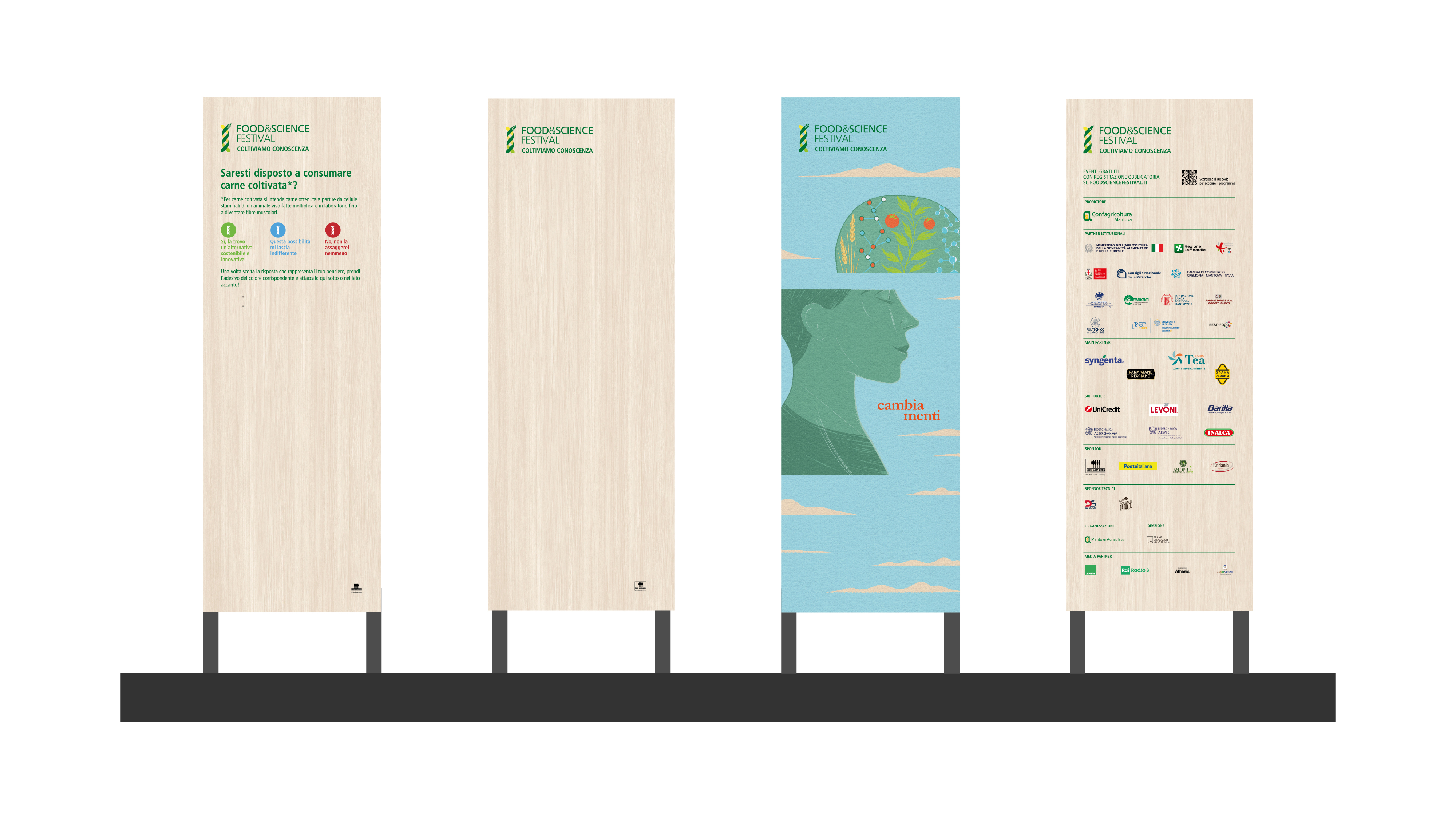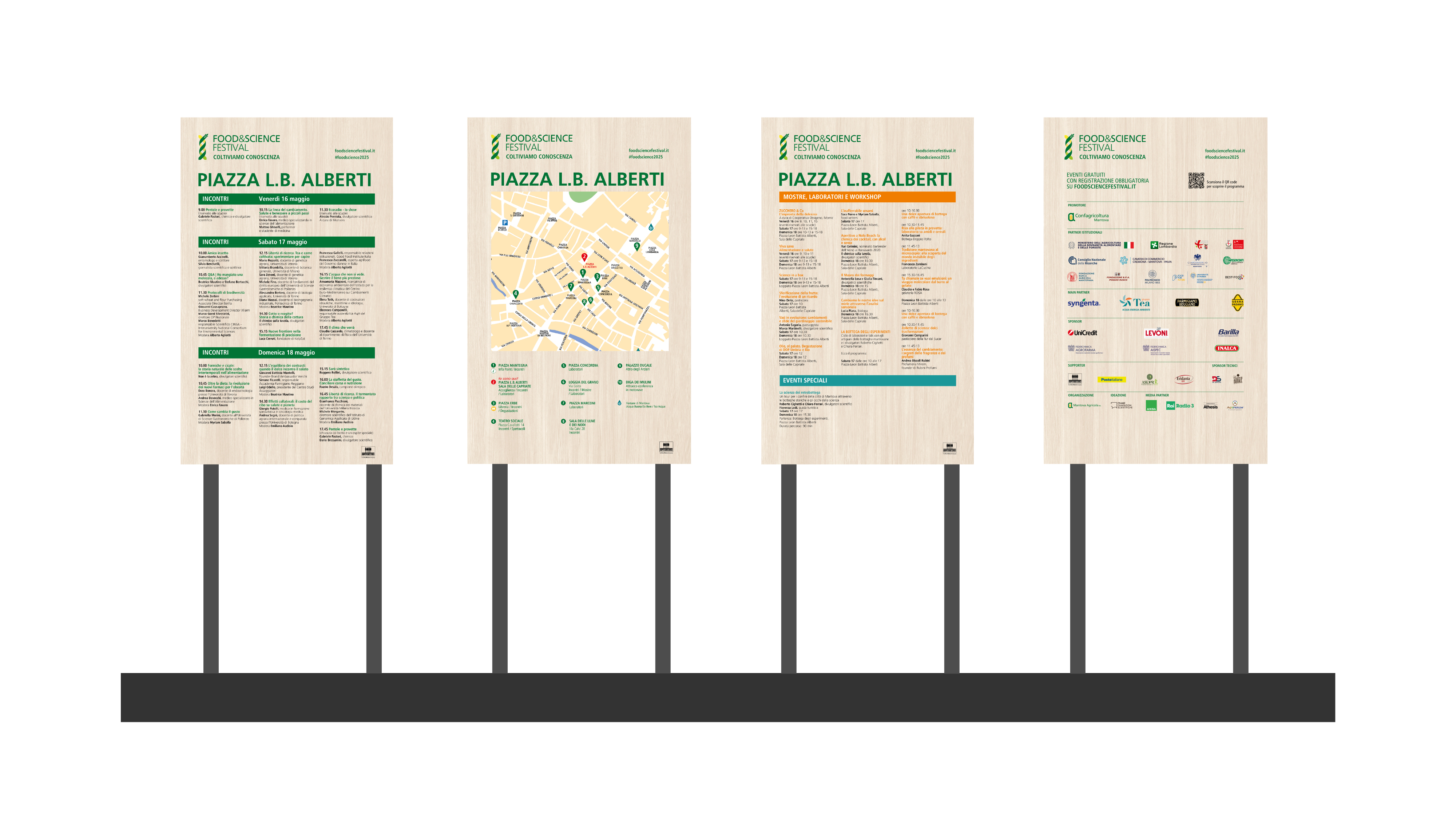 Gli spazi della città sono stati valorizzati attraverso un progetto di allestimenti grafici che abbiamo ideato e realizzato: dalle piazze ai palazzi storici, ogni luogo si è trasformato in parte integrante del racconto visivo dell’evento, sia all’interno che all’esterno delle location. In particolare, ci siamo occupati della personalizzazione dei gazebo degli stand e, insieme a Galenos, della creazione concettuale dei totem interattivi, oltre che della progettazione e produzione dei totem in legno informativi destinati alle diverse location. In giro per la città, invece, sono stati collocati totem specchio e i totem bifacciali o monofacciali, informativi e/o dedicati agli sponsor.